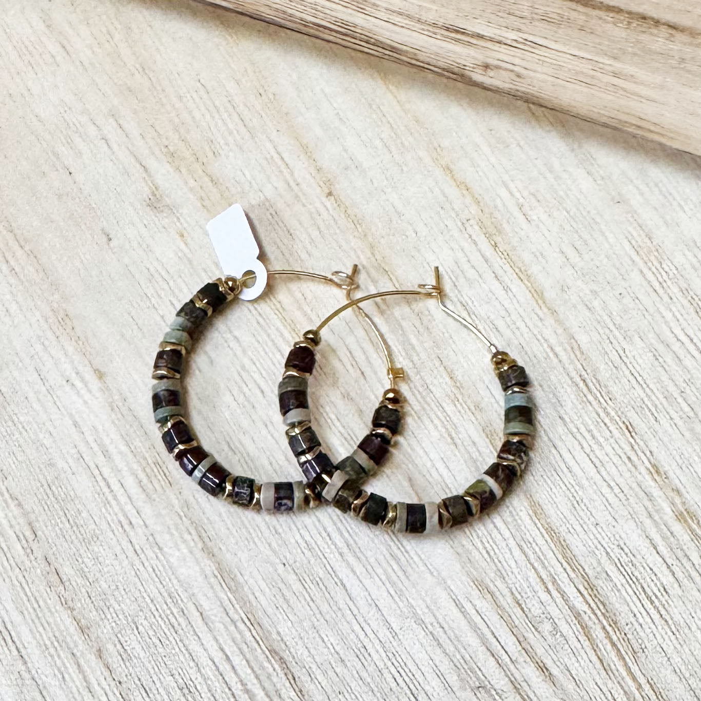 Les créoles MOUSSE sont composées de perles de jaspes, agates mousse et de perles en hématite.